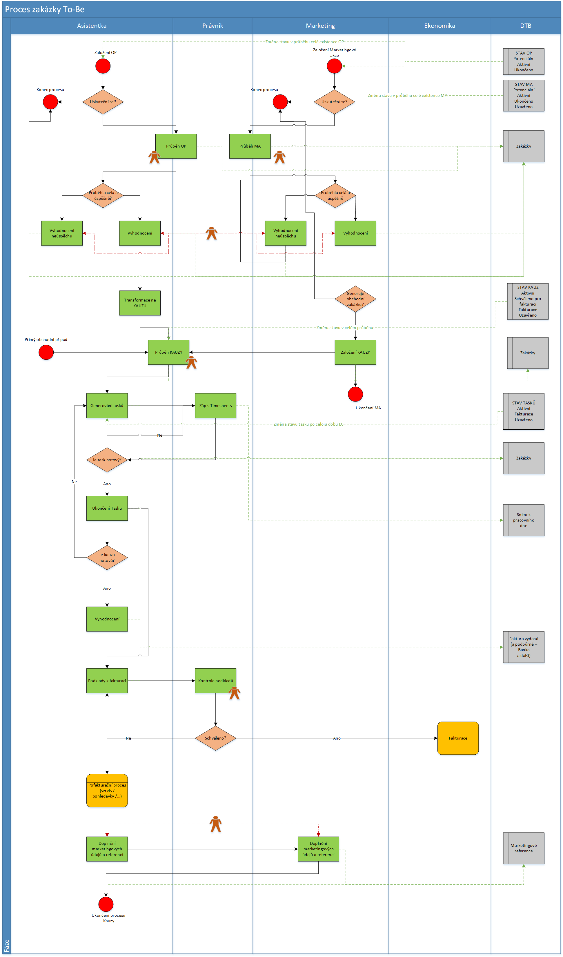 - Jakákoliv externí zakázka měla nově vstupovat do jednotného procesu s jedním životním cyklem a zjednodušeným stavovým číselníkem tak, aby JEDEN proces pokryl všechny možnosti a tím byla zaručena konzistence dat. Zároveň musel být proces důkladně popsán a uveden jako „Pravidlo evidování zakázek“ tak, aby všechny týmy evidovaly svou práci jednotně, správně a úplně. Byly přidány či pozměněny důležité atributy pro marketingové i účetní oddělení a zároveň byl vytvořen vztah jejich propadu na podřízené zakázky. Byly vytvořeny nové třídy k evidování informací o zakázkách, které dosud nebylo možno zapisovat a byly připraveny i další funkcionality zapadající do požadavků (místy dokonce v rámci legislativní nutnosti) businessu.