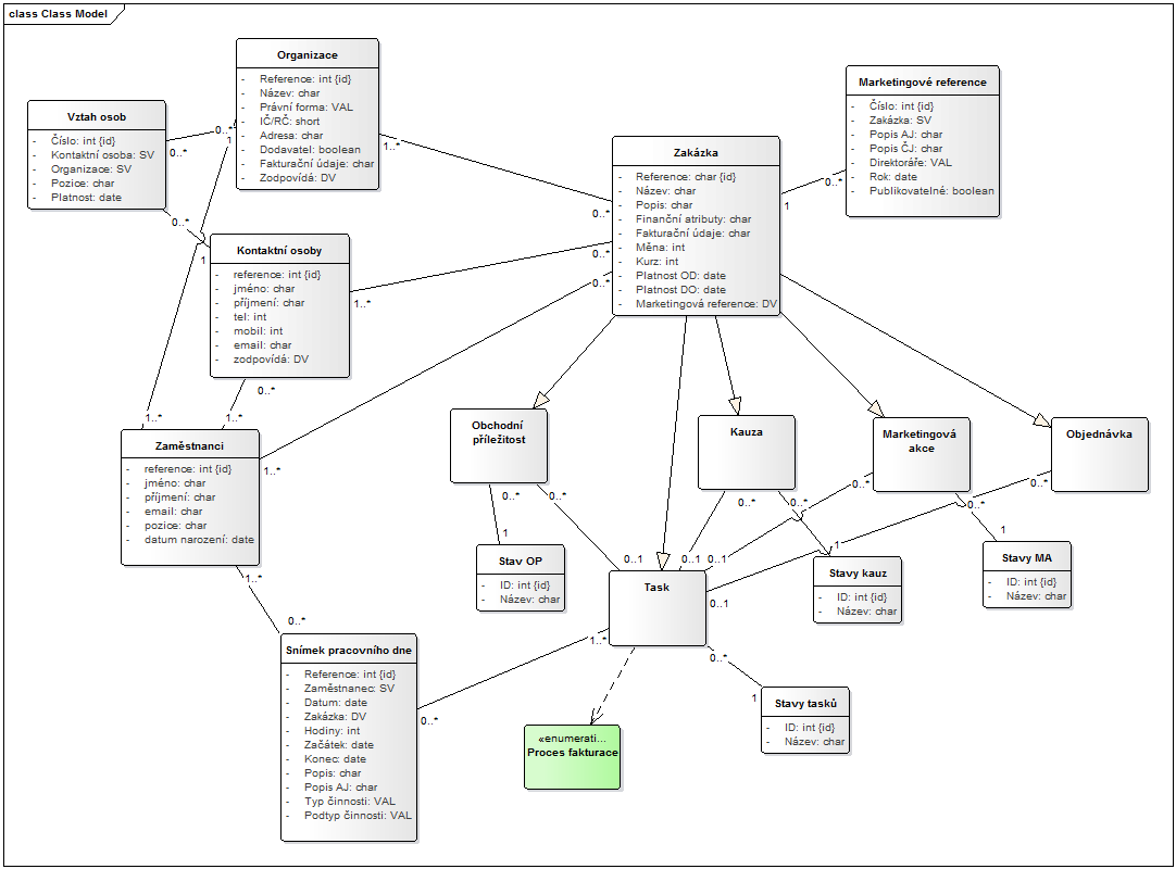 Jak je vidět, a je to i logické, stěžejní jsou třídy generované třídou „Zakázka“, která obsluhuje všechny své mutace, které dědí její vlastnosti a pro své účely si je modifikují. Pro zjednodušení jsem u jednotlivých tříd nespecifikoval atributy a ty doplnil jen u třídy Zakázka – všechny tyto atributy jsou dále děděny. Třídy typu zakázka kopírují proces zakázky tak, jak jsme viděli výše. V původní realitě fungovalo však tříd méně – kauza, task a objednávka. Třídy obchodní příležitost a marketingová akce sice v systému reálně byly, avšak nebyly nikterak využívány. My jsme je do procesu zahrnuli a to z podstatných důvodů vzhledem k požadavkům businessu: